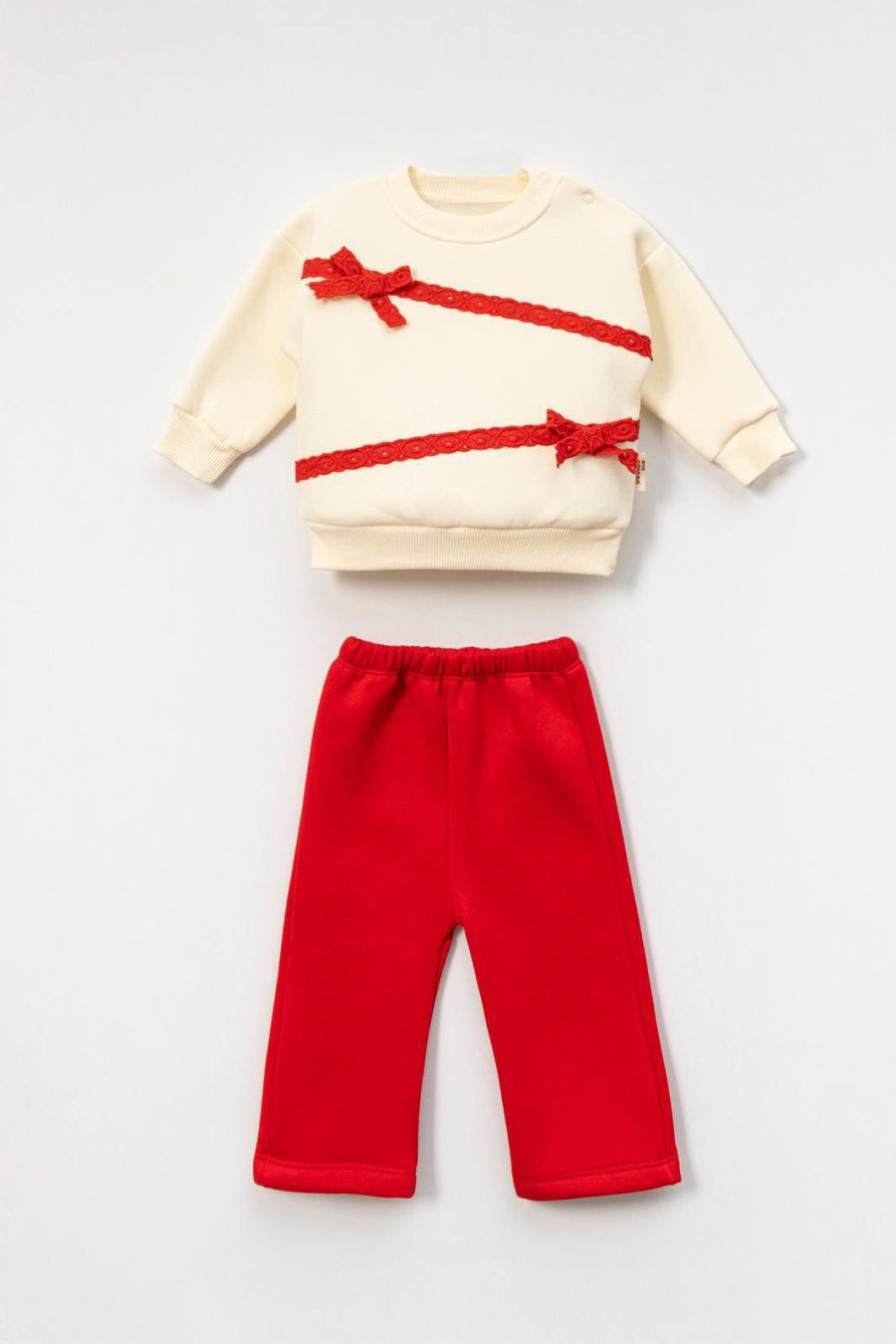 طقم بناتي شتوي باللون الأحمر والبيج للأعمار ٦-٢٤ شهر